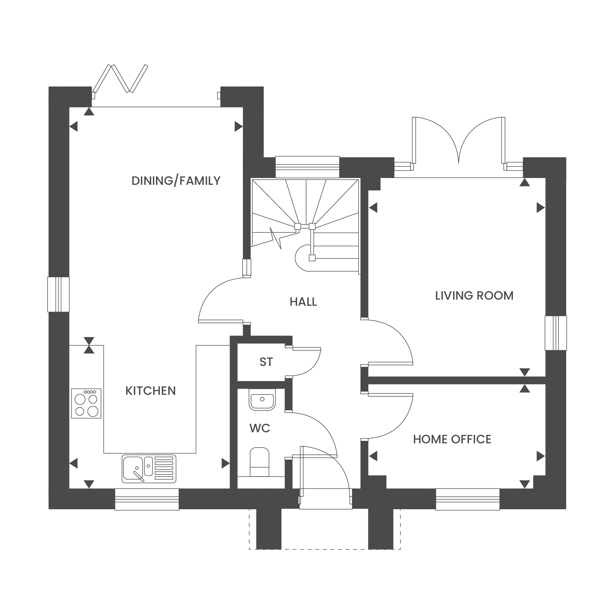 The ground floor of Fairbourne House is designed for a versatile modern lifestyle. At the front, a designated home office offers a quiet place to focus, away from the main living spaces within the home. To the rear, the open plan kitchen, family, and dining area serves as the heart of the house, complete with bi-fold doors that open out to the garden.