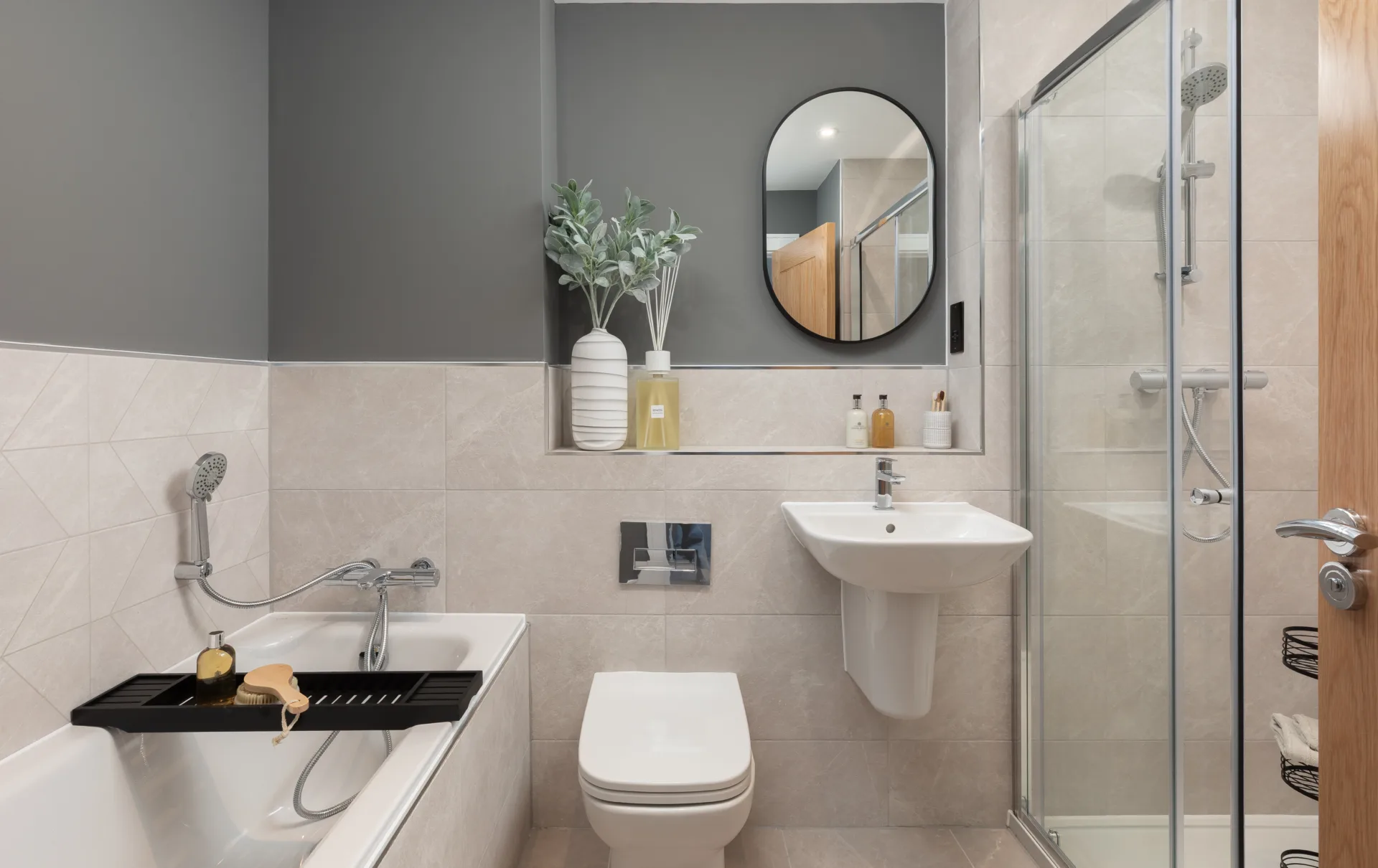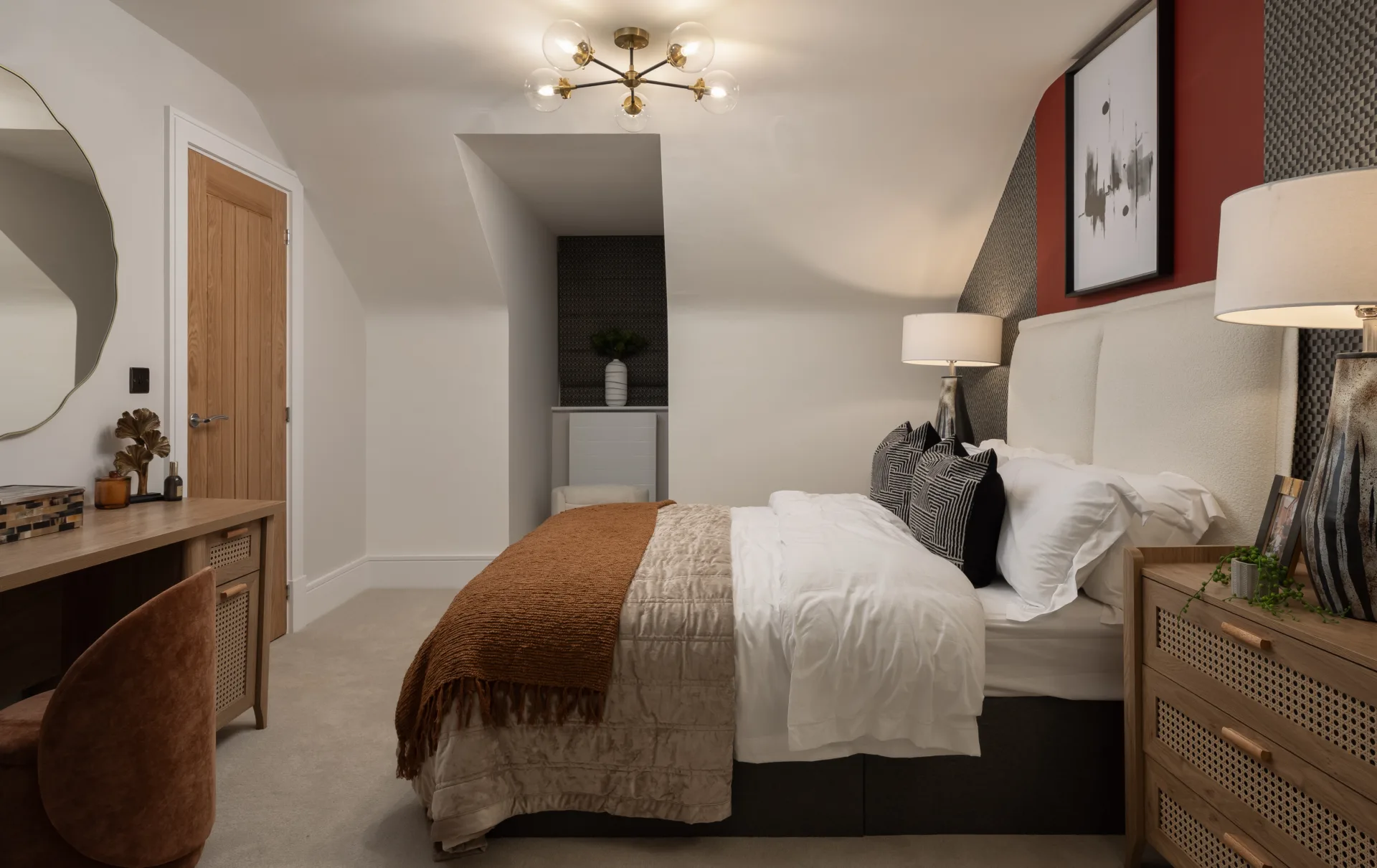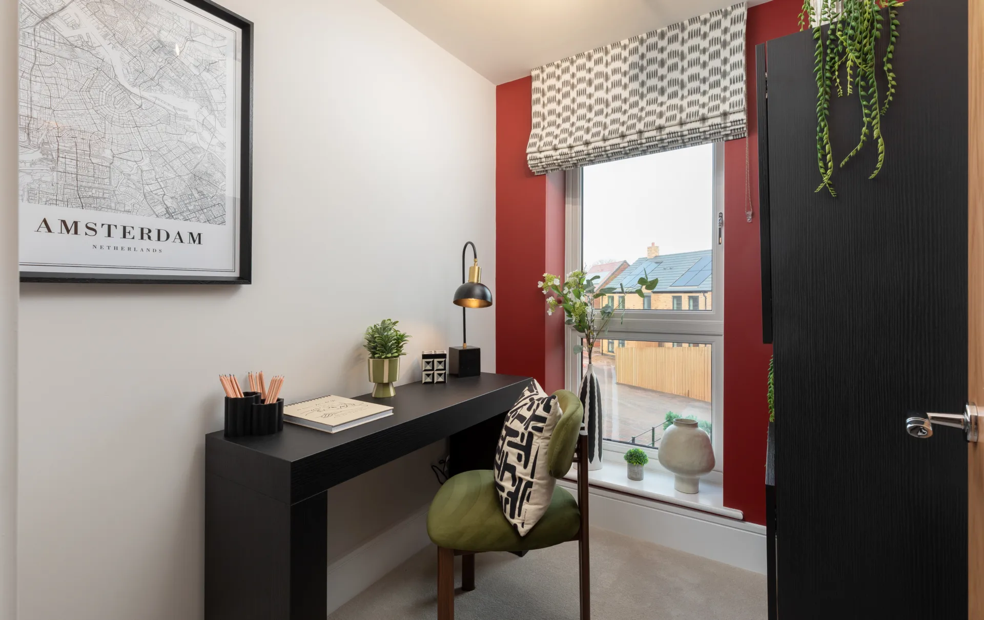 The first floor boasts three spacious bedrooms and a sleek family bathroom. By following the staircase to the second floor, you’ll discover the statement top-floor primary suite, featuring a vaulted ceiling, a dedicated dressing area, and a private en-suite.